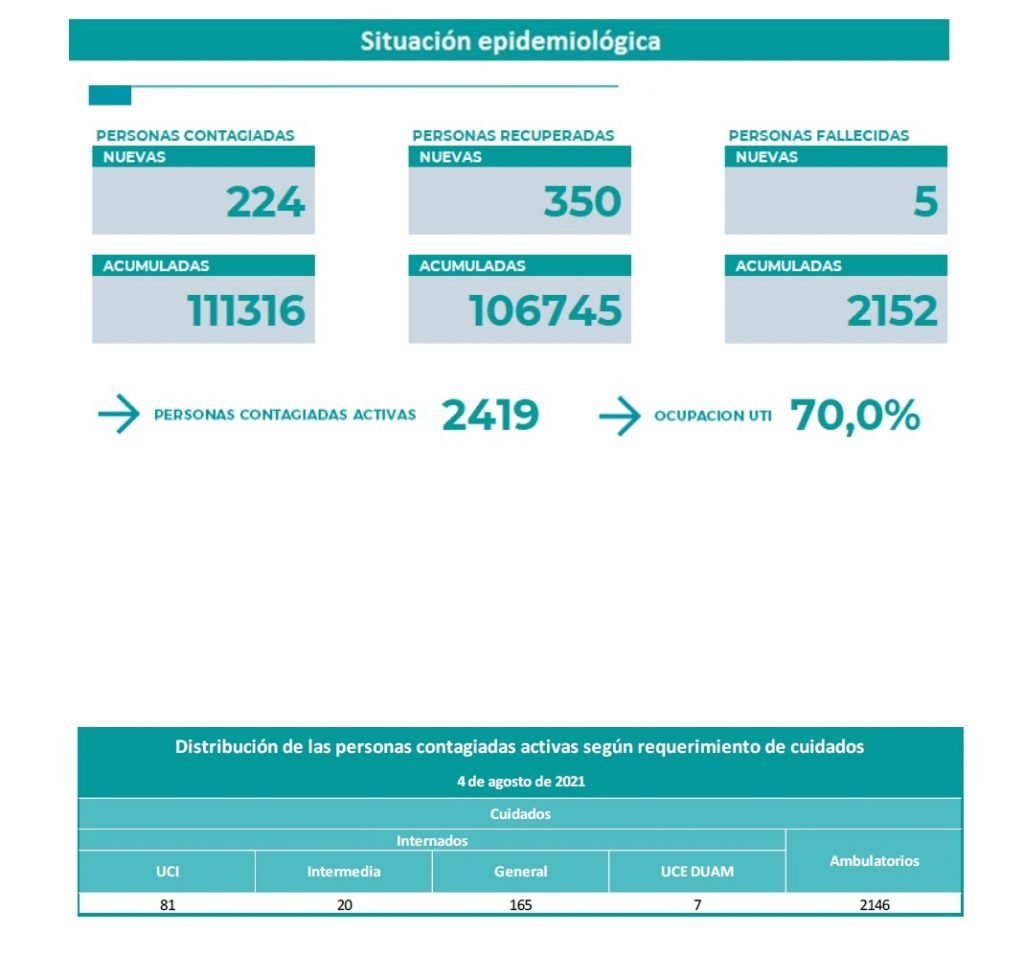 Se informó también que murieron 5 personas y por ello hay 2419 personas que actualmente cursan la enfermedad en la provincia. También se mantiene la ocupación de terapia intensiva en el orden del 70%.