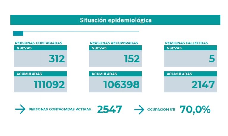 En cuanto a los pacientes recuperados son 152 mientras que los casos activos son 2.547. Hoy, se advirtió un incremento en un punto del porcentaje de ocupación de camas UTI: es del 70 %.