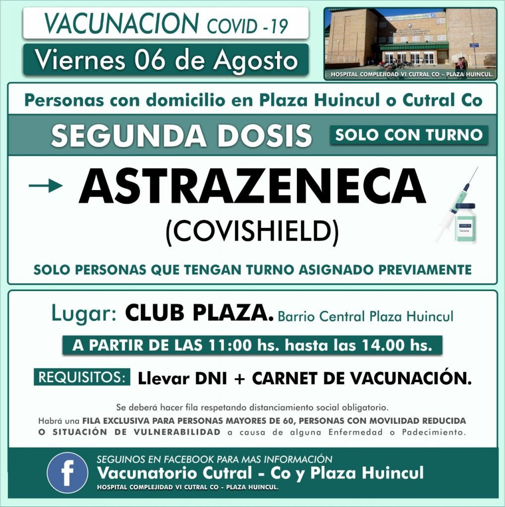 Este viernes, en el club Atlético Plaza Huincul se llevará a cabo el operativo de vacunación de segundas dosis para aquellas personas que recibieron Astrazéneca (Covishield), con turno previo. Será desde las 11 hasta las 14.