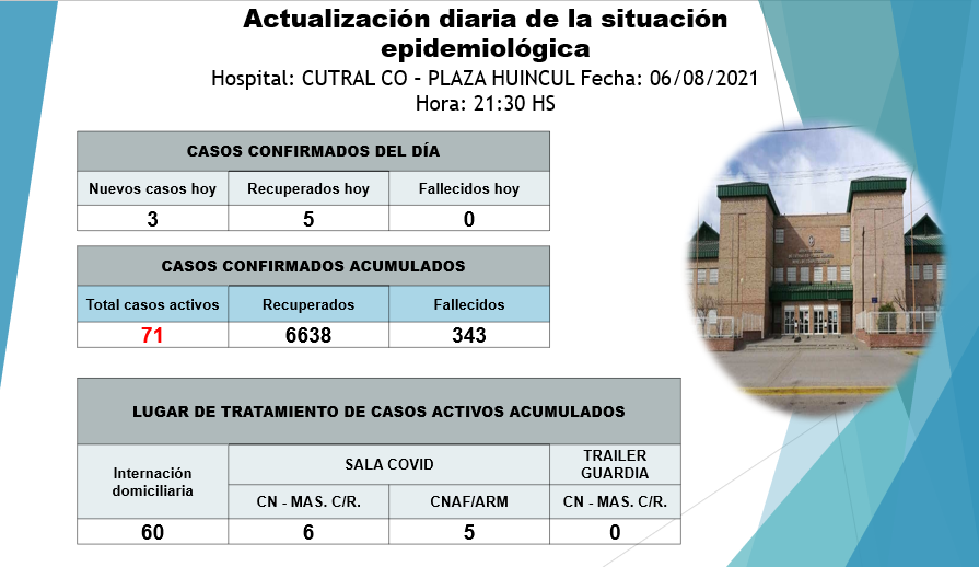 En la actualización de la situación epidemiológica de este viernes 6 de agosto, el hospital de Cutral Co y Plaza Huincul informó que hubo tres nuevos casos de coronavirus, cinco pacientes recuperados y sin fallecidos.