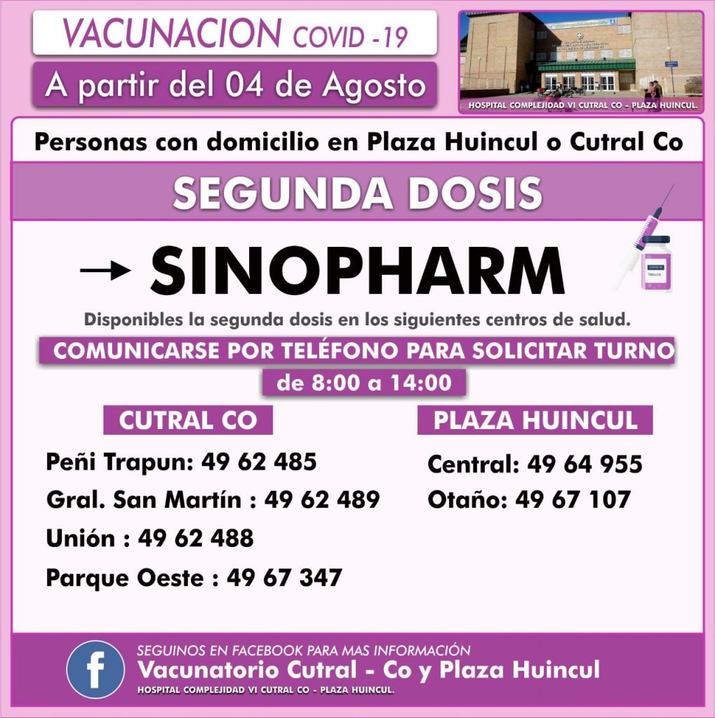 Desde el vacunatorio del hospital de Cutral Co y Plaza Huincul se informó que las personas que deben aplicarse la segunda dosis de Sinopharm podrán solicitar turno en alguno de los seis centros de salud para que les otorguen un turno.