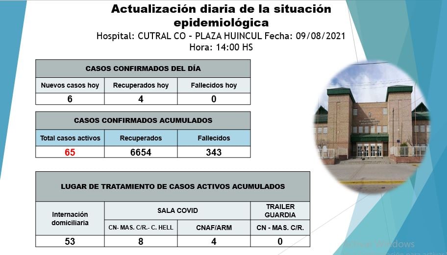 Mientras que en internación domiciliaria hay 53 pacientes. En total, los casos activos en Cutral Co y Plaza Huincul subió a 65. La nómina de personas fallecidas es de 343 en las dos ciudades.