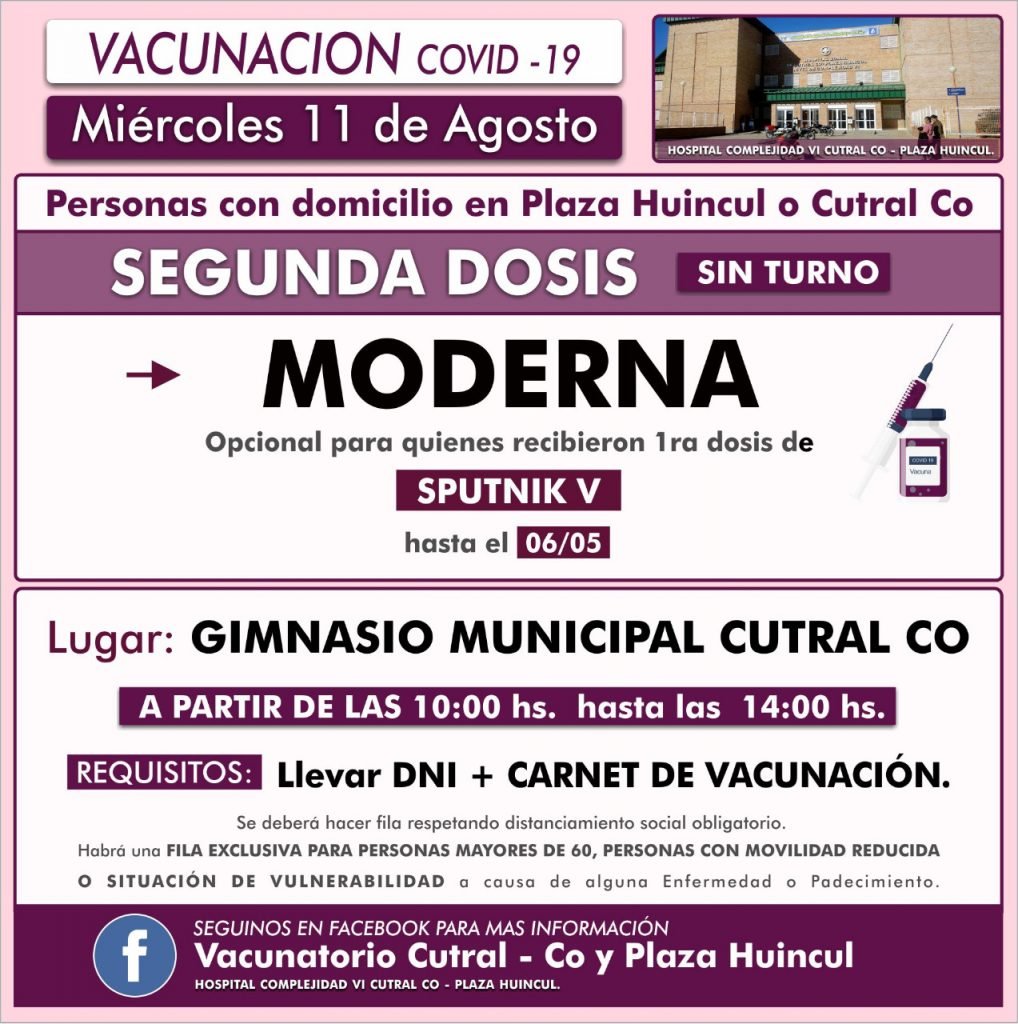El miércoles 11 de agosto se aplicará la segunda dosis de Moderna, sin turno en el gimnasio municipal “Enrique Mosconi” de Cutral Co.