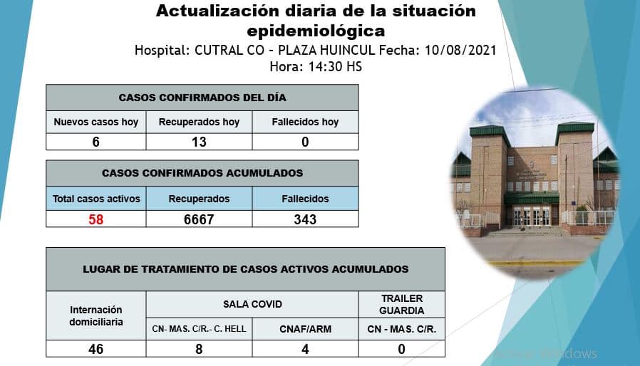 Mientras que en internación domiciliaria hay 46 pacientes. En total, los casos activos en Cutral Co y Plaza Huincul son 58. La nómina de personas fallecidas es de 343 en las dos ciudades.