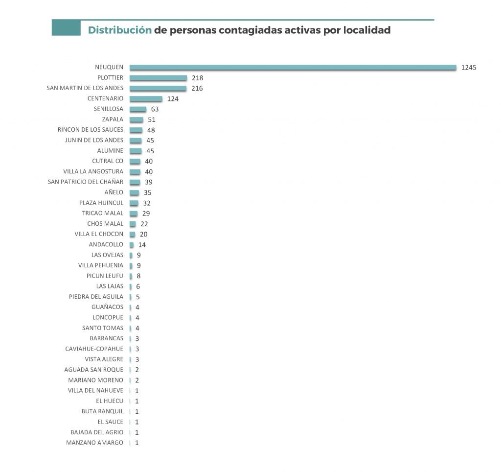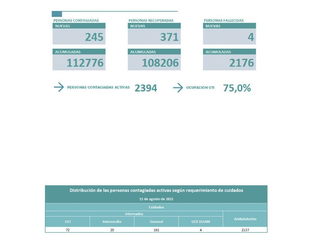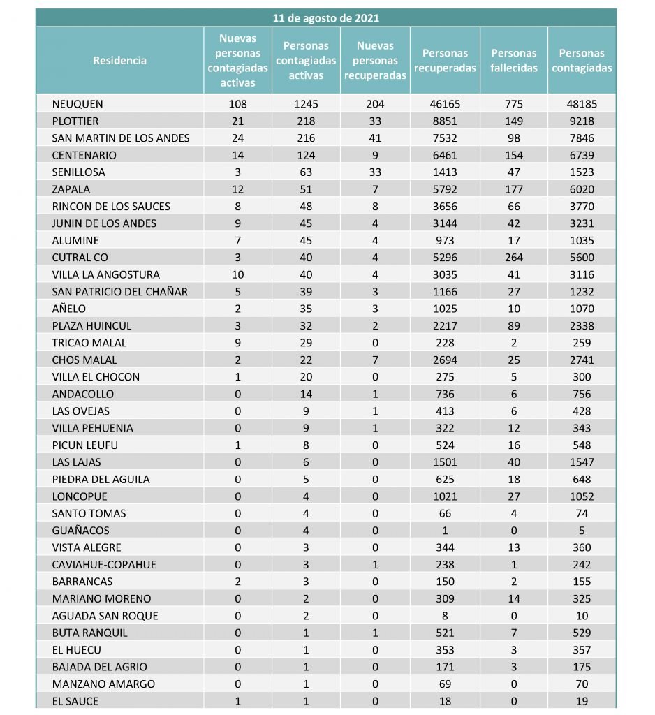En cuanto a las personas recuperadas son 371en todo el territorio neuquino y los casos activos son 2394. En cuanto a la ocupación de las camas UTI, el porcentaje es del 75 %.