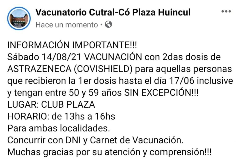 Hoy, sábado desde el Vacunatorio de Cutral Co y Plaza Huincul se informó que se llevará adelante la vacunación con segundas dosis de AstraZeneca (Covishield) para vecinos y vecinas de 50 a 59 años, que recibieron la primera dosis hasta el 17 de junio.