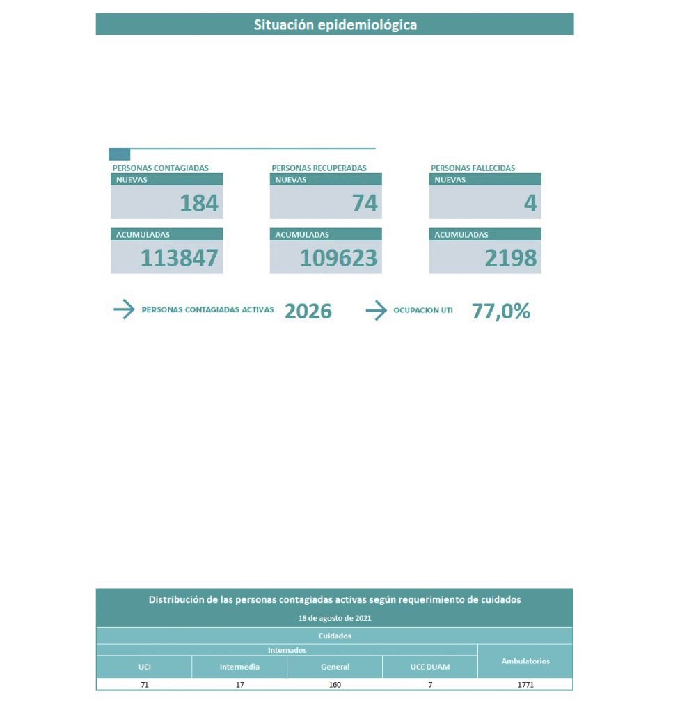 Esta jornada tuvo 74 personas recuperadas y 2026 casos activos. Se mantiene igual, la ocupación en las camas UTI que tiene un porcentaje del 77 %.