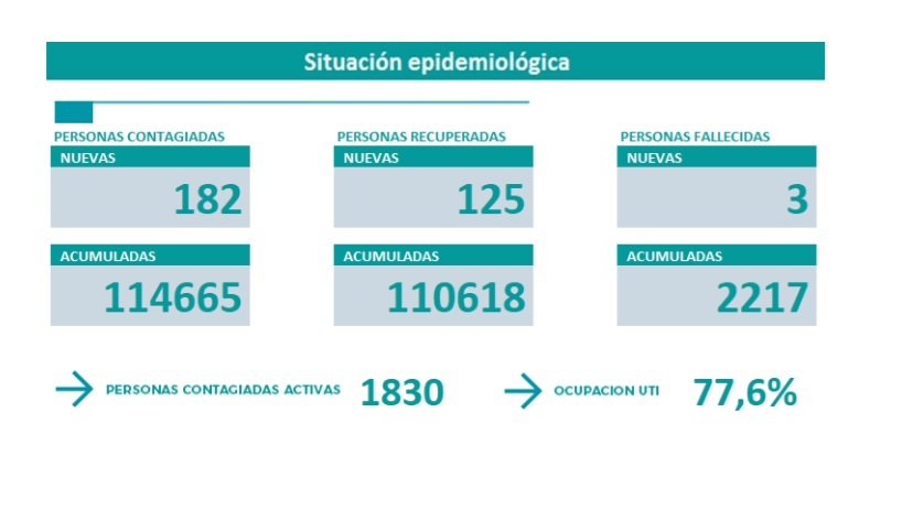 En cuanto a las personas recuperadas son 125 en todo el territorio provincial. Los casos activos en la provincia son 1.830. La ocupación de las camas UTI se mantiene en el mismo porcentaje, que ronda el 77,6 % en toda la provincia.