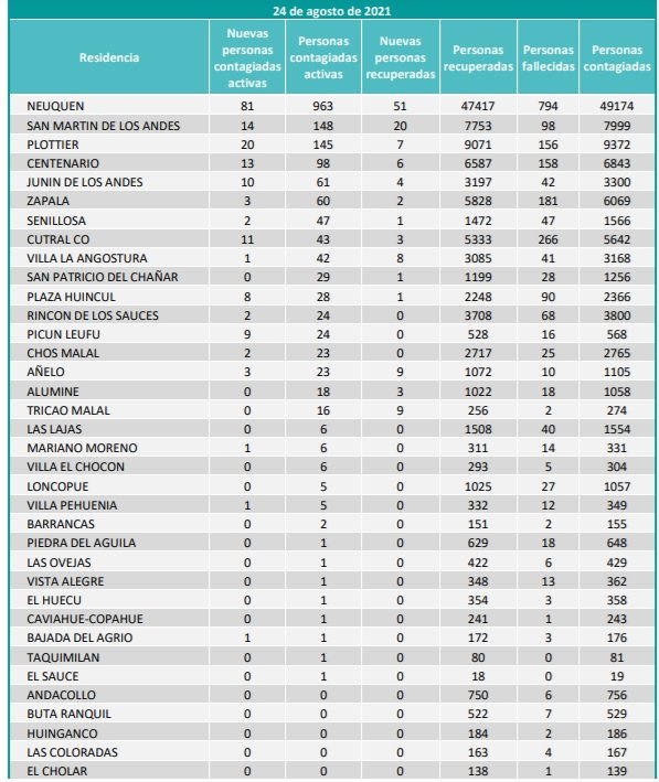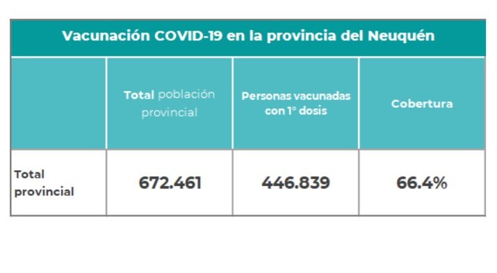 Desde el comité de emergencia, se indicó además que el porcentaje de personas vacunadas en toda la provincia de Neuquén alcanza el 66,4 % y son 672.461 las personas vacunadas.