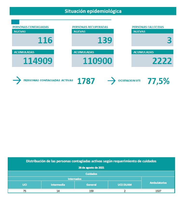 Además se detalló que hubo 139 personas recuperadas y que actualmente están contagiadas 1787 personas en toda la provincia.