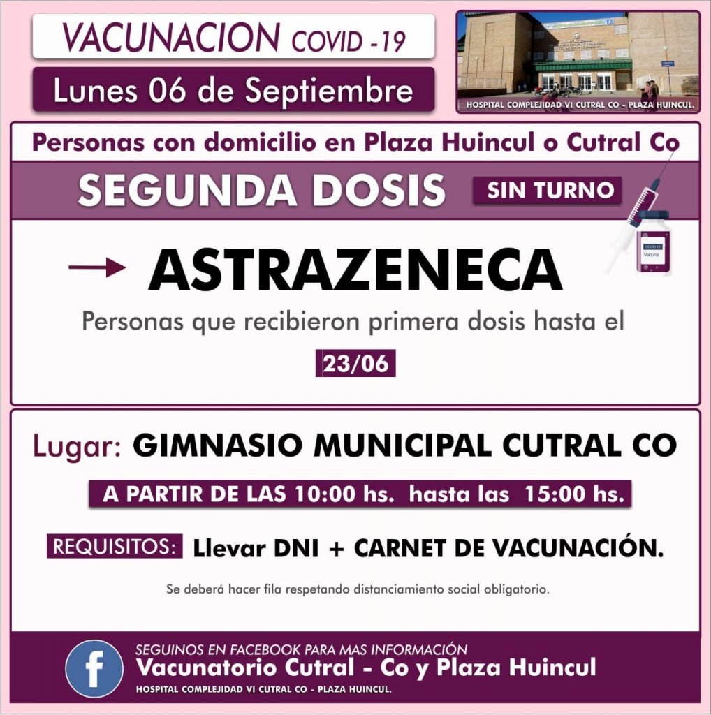 La convocatoria es para aquellas personas que viven en Cutral Co o en Plaza Huincul y que recibieron la primera dosis hasta el 23 de junio de este año. Será en el gimnasio municipal “Enrique Mosconi” de Cutral Co, situado en San Juan y Principal Sàez del barrio Cooperativa.