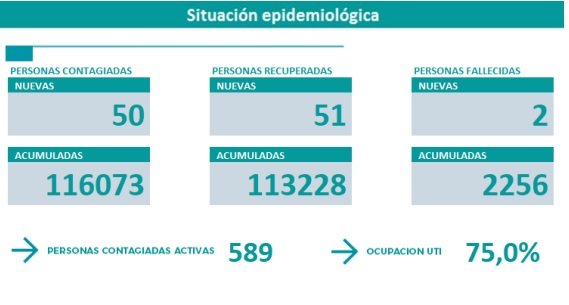 Los casos activos en el territorio provincial son 589 en toda la provincia. Por otra parte, la tasa de ocupación de UTI es del 75,00 % en la provincia, según informó el comité de emergencia provincial.
