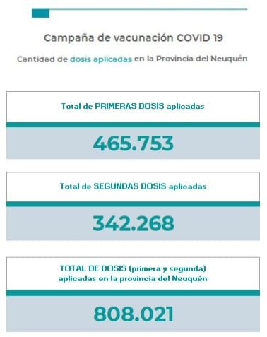 A la vez, se indicó que hubo 465.753 primeras dosis de vacunación contra el covid 19 y 342.286 segundas dosis.