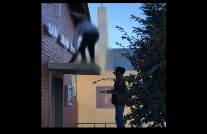 Se puede ver allí que uno sube a la parte superior del porche de la iglesia y desde allí efectúa un salto para caer en la rampa. Afortunadamente no se lastimó y tampoco dañó las instalaciones.