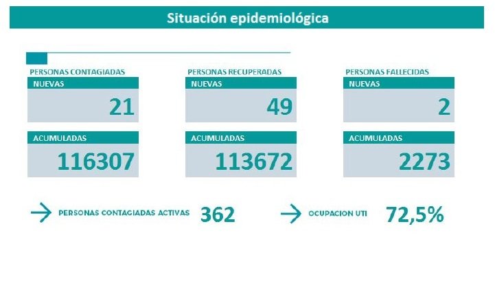 En cuanto a las personas recuperadas en todo el territorio provincial, se indicó que fueron 49 y son 362 los casos activos. En tanto, la ocupación de las camas UTI es el 72,5 % en toda la provincia.