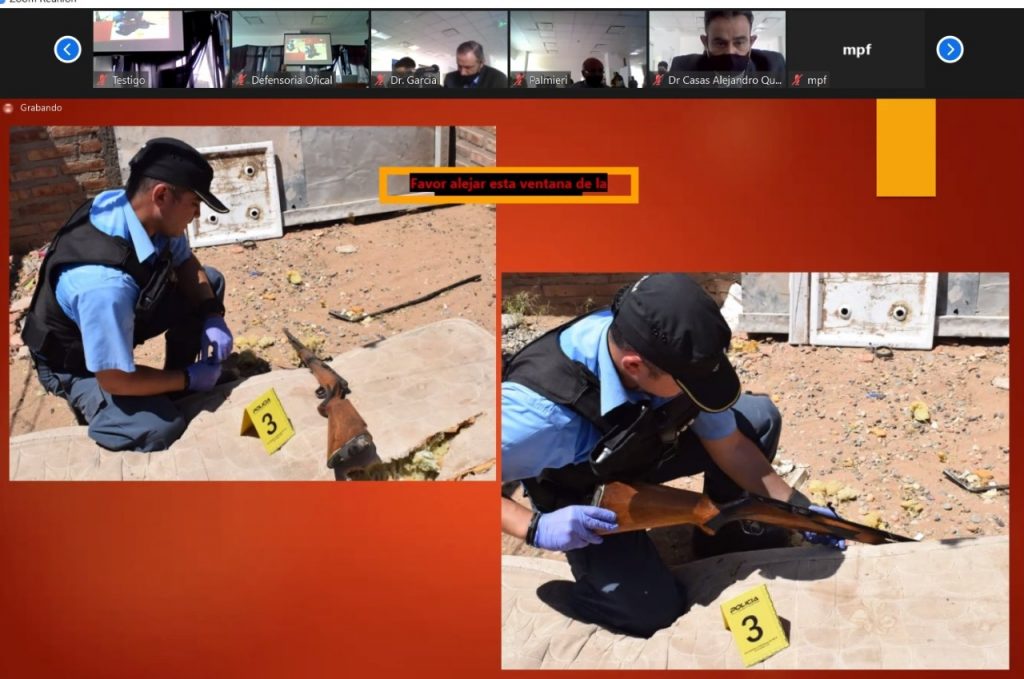 Relató que de esos peritajes, se pudo establecer que la persona que efectuó el disparo estuvo en un paredón a 2,5 metros de altura y a 68 metros de distancia de la víctima. Además explicó que se secuestró un arma. Era una escopeta con culata de madera que estaba apoyada sobre un colchón en el patio de la casa lindera a la de la familia Espinoza, que vive en Buta Ranquil y Zapala.