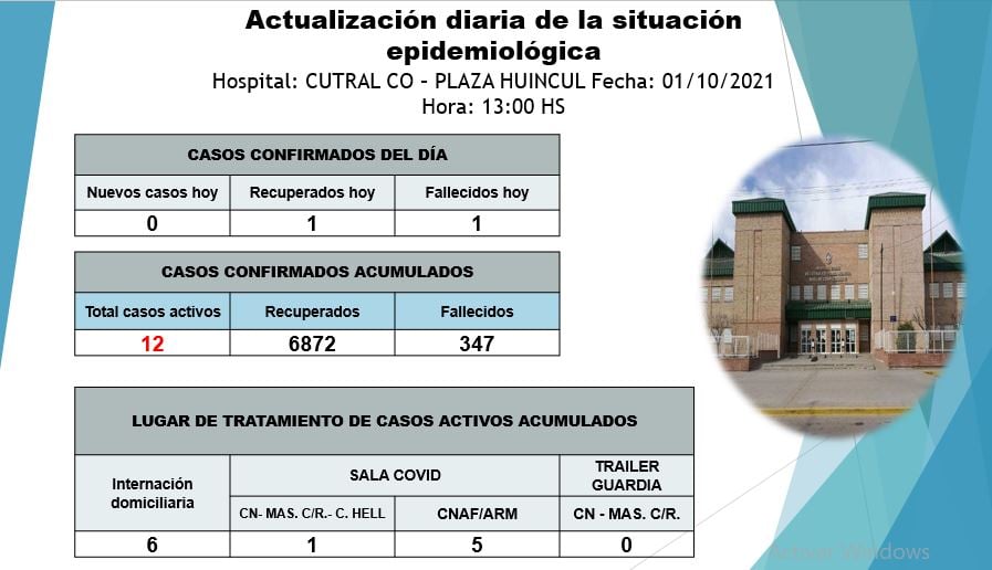 Este viernes, desde el hospital de Cutral Co y Plaza Huincul se confirmó que hubo una persona fallecida por coronavirus y un paciente recuperado. Hoy no se registraron nuevos casos.