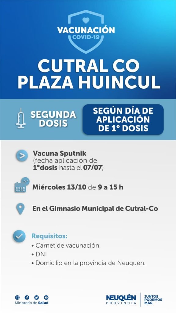 Este miércoles vacunarán con la segunda dosis de vacuna Sputnik V en el gimnasio municipal de Cutral Co. Será para quienes se hayan aplicado la primera dosis hasta el 7 de julio inclusive.