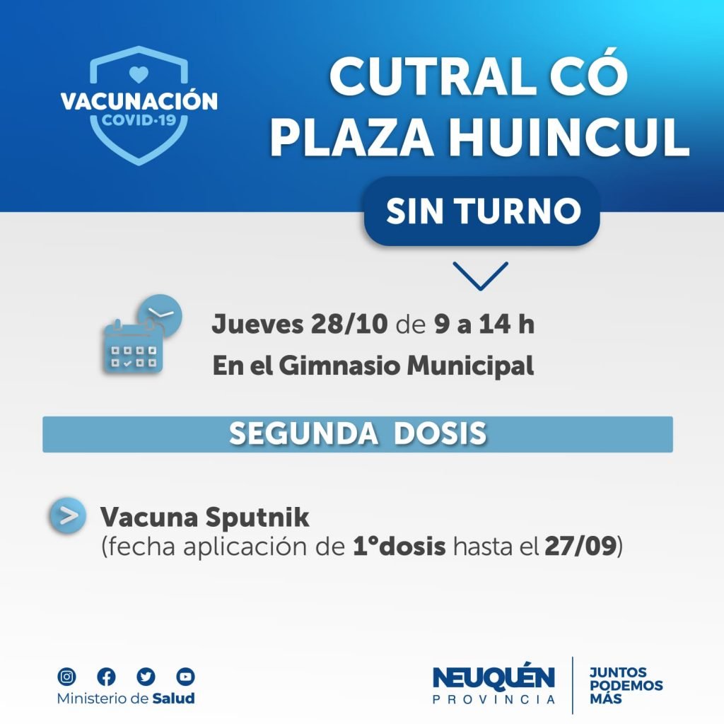 Desde el Vacunatorio se informó que este jueves 28 se aplicarán las segundas dosis de Sputnik V en el gimnasio municipal “Enrique Mosconi” de Cutral Co.
