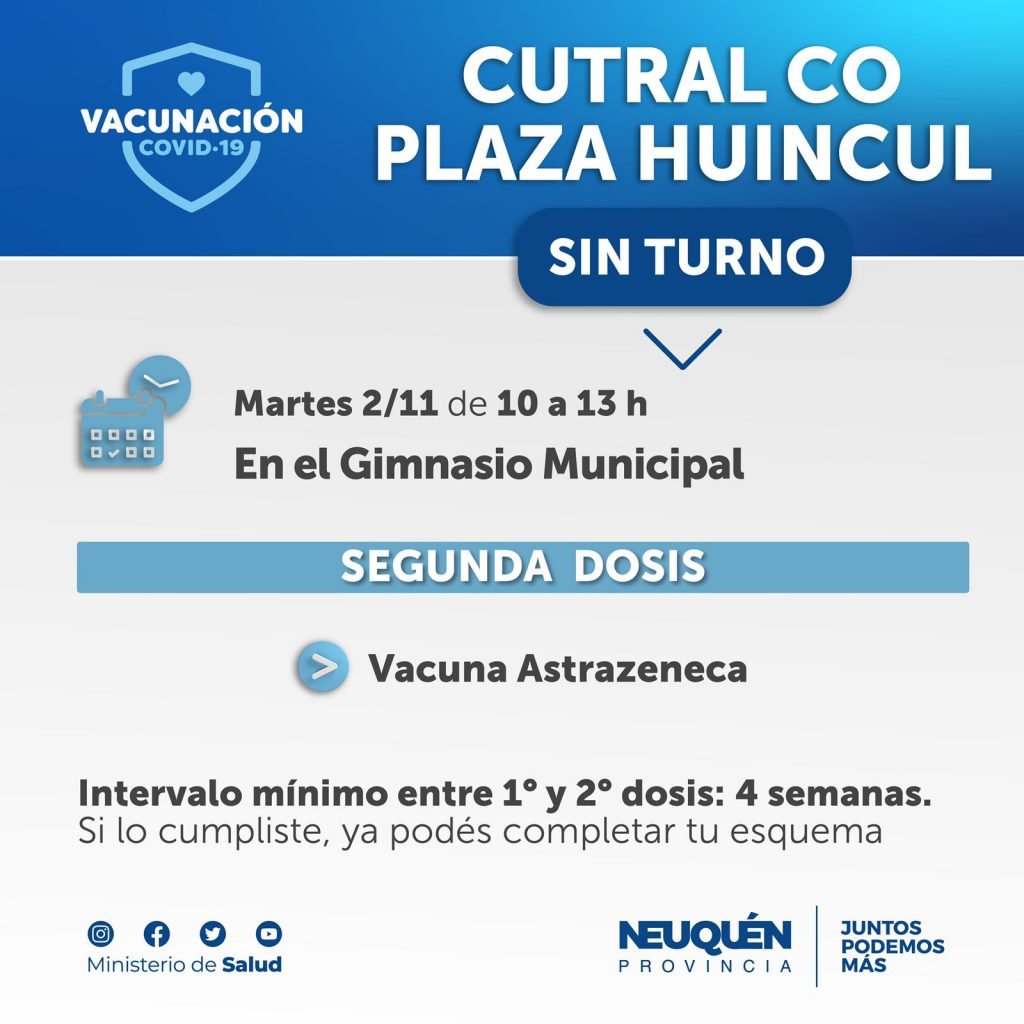 Desde el vacunatorio se informó que este martes se llevará a cabo el operativo de aplicación de segundas dosis, sin turno en el gimnasio municipal “Enrique Mosconi” de Cutral Co. Será de 10 a 13:00.