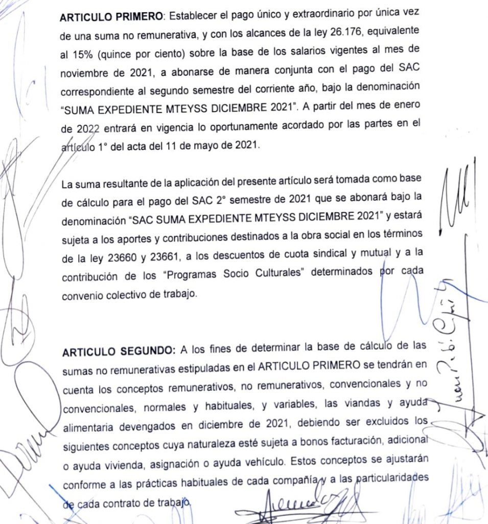 El documento detallaque se le brinda a los trabajadores “un incremento del 35% ( treinta y cinco por ciento) sobre los valores salariales vigentes al mes de noviembre del 2021 y que se debían efectivizar en tres etapas, siendo la primera de ellas por un 15% (quince porciento) a partir del mes de enero 2022″.