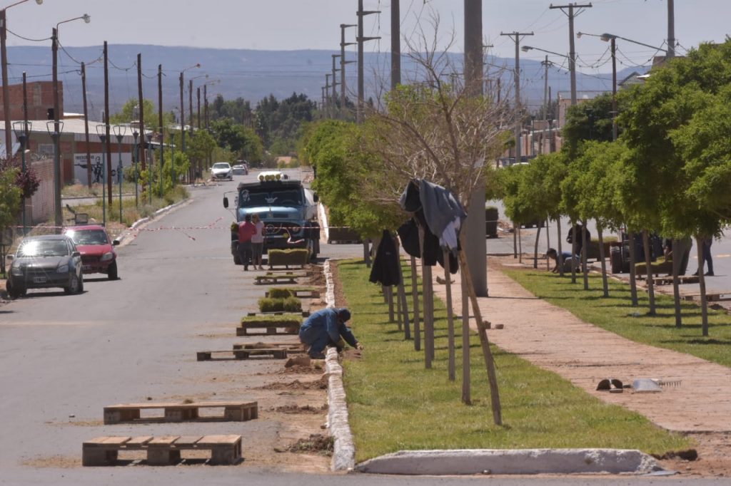 Las tareas de colocación de panes de césped en el bulevar de la avenida Benito Pérez de Plaza Huincul. Las tareas permiten completar las obras de mejoras en el sector.