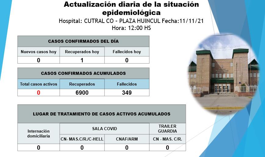 En el informe emitido este 11 de noviembre por parte de Empidemiología del hospital Complejidad Media, se anunció que en Cutral Co y Plaza Huincul no hay casos activos de covid-19