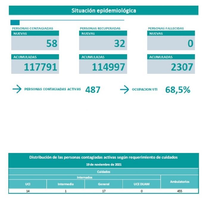 En cuanto a los casos activos en la provincia son 487 y el porcentaje de ocupación de camas UTI es del 68,5 %.