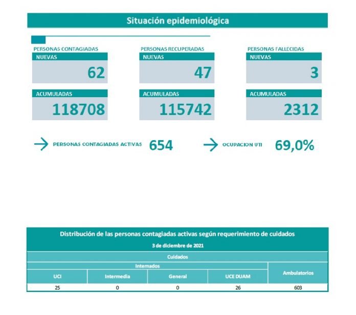 En cuanto a las personas recuperadas y reportadas son 47. Los casos activos son 654 mientras que la ocupación de camas UTI es del 69 %.