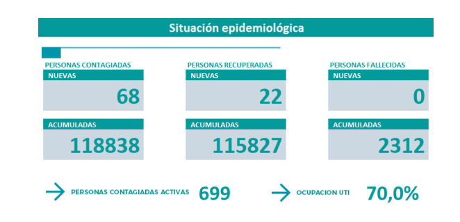 Son 68 los casos activos y fueron 22 las personas que se recuperaron, por lo que quedaron 699 personas que cursan la enfermedad.