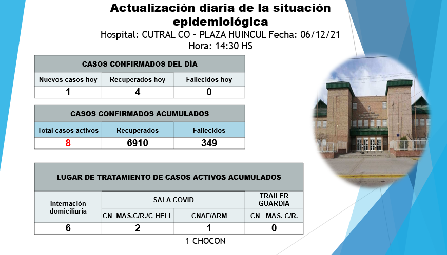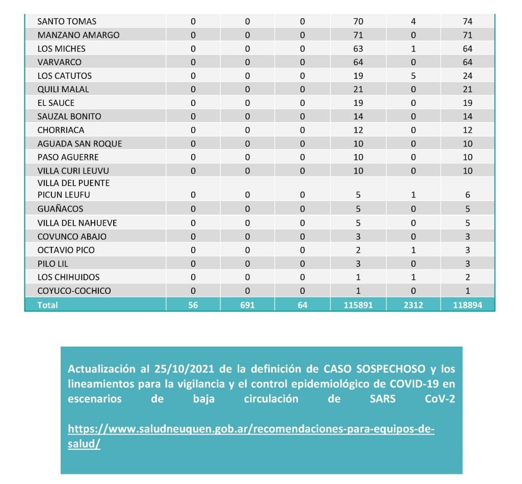 En tanto, que en Cutral Co y Plaza Huincul, el hospital local informó cuatro casos recuperados. En cuanto a los pacientes internados, en la sala covid hay dos pacientes y otro en terapia intensiva con asistencia respiratoria mecánica, aunque se aclara que es de Villa El Chocón.