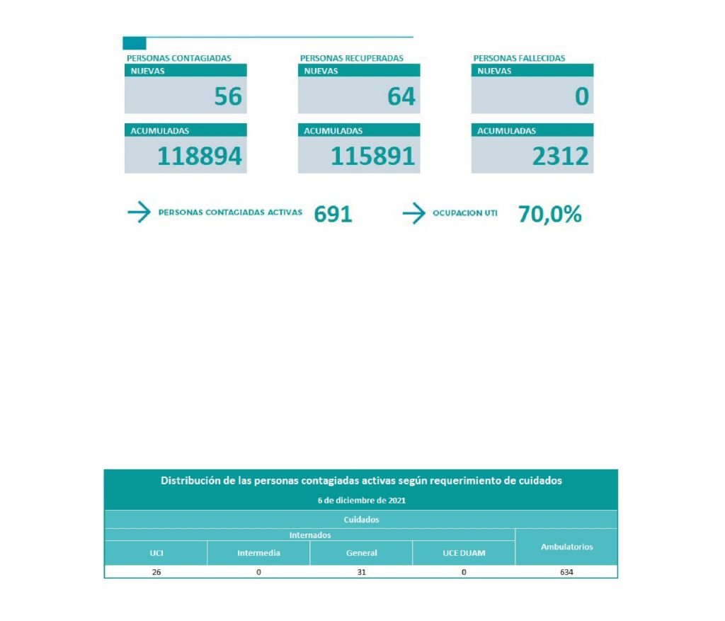 El informe de provincia indicó que hay 64 personas recuperadas y los casos activos en todo el territorio provincial son 691 y la ocupación de camas UTI sigue siendo del 70 %.
