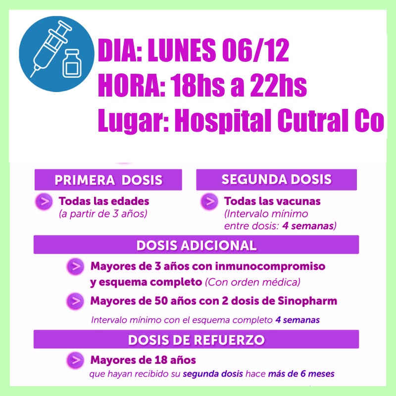Este lunes se le dará continuidad a la tarea de vacunar a la población de Cutral Co y Plaza Huincul contra el COVID-19 para todas las personas mayores de 3 años.