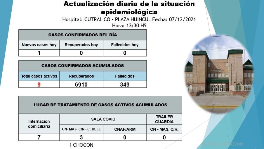 En el hospital local, hay tres personas internadas en sala covid, una de las cuales es de Villa El Chocón. Hay 7 con internación domiciliaria y el total es de 9 casos activos.
