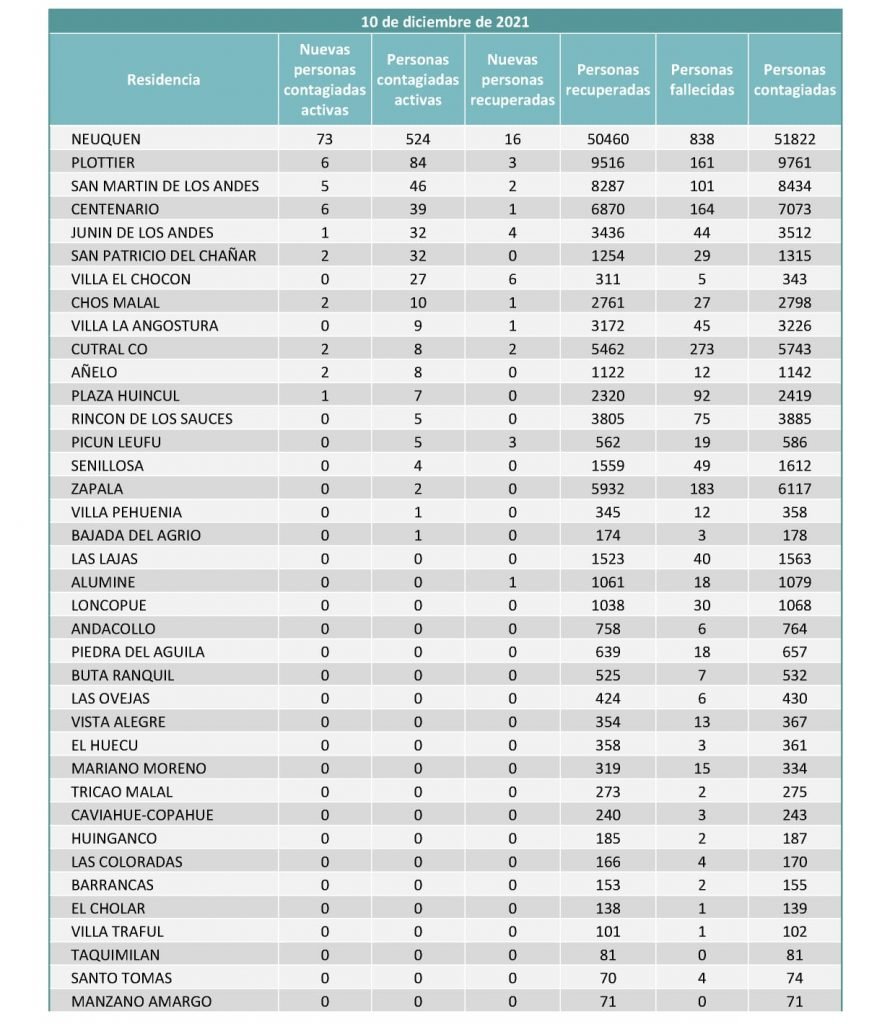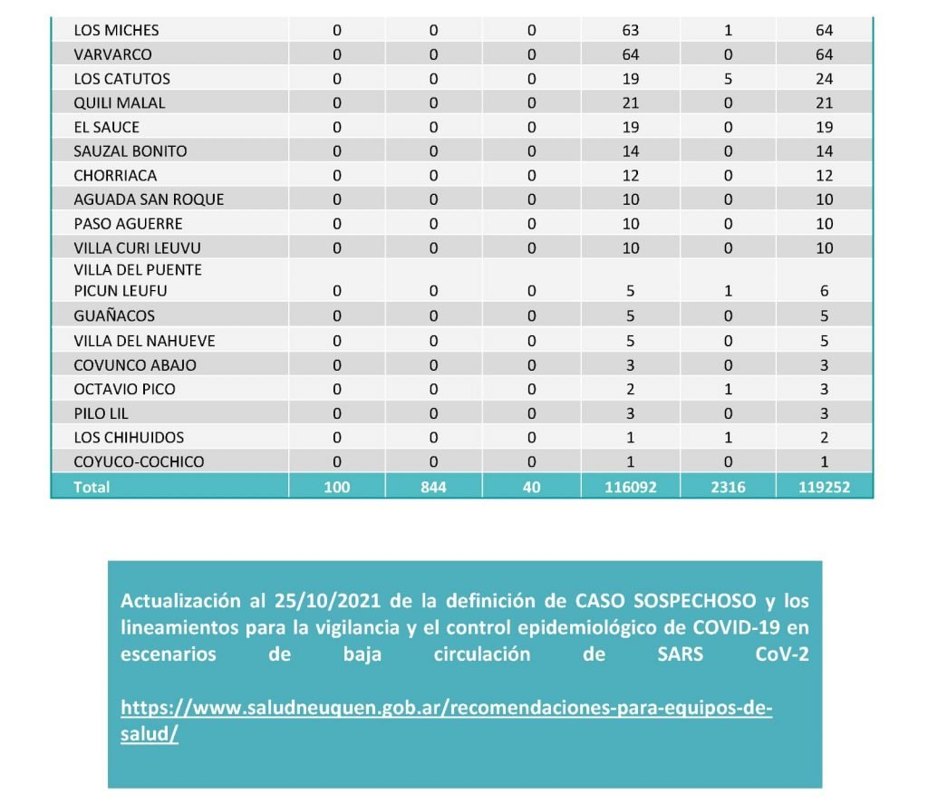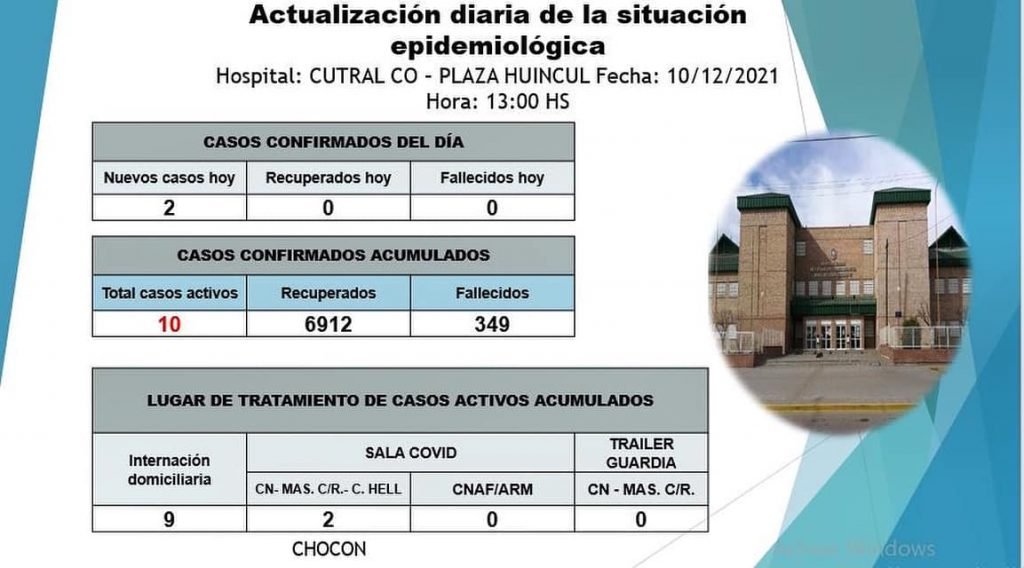 En Cutral Co y Huincul, la situación epidemiológica informada es de 10 casos activos. Los internados son dos, uno de ellos de Villa El Chocón. En sus domicilios, hay nueve personas transitando la enfermedad.