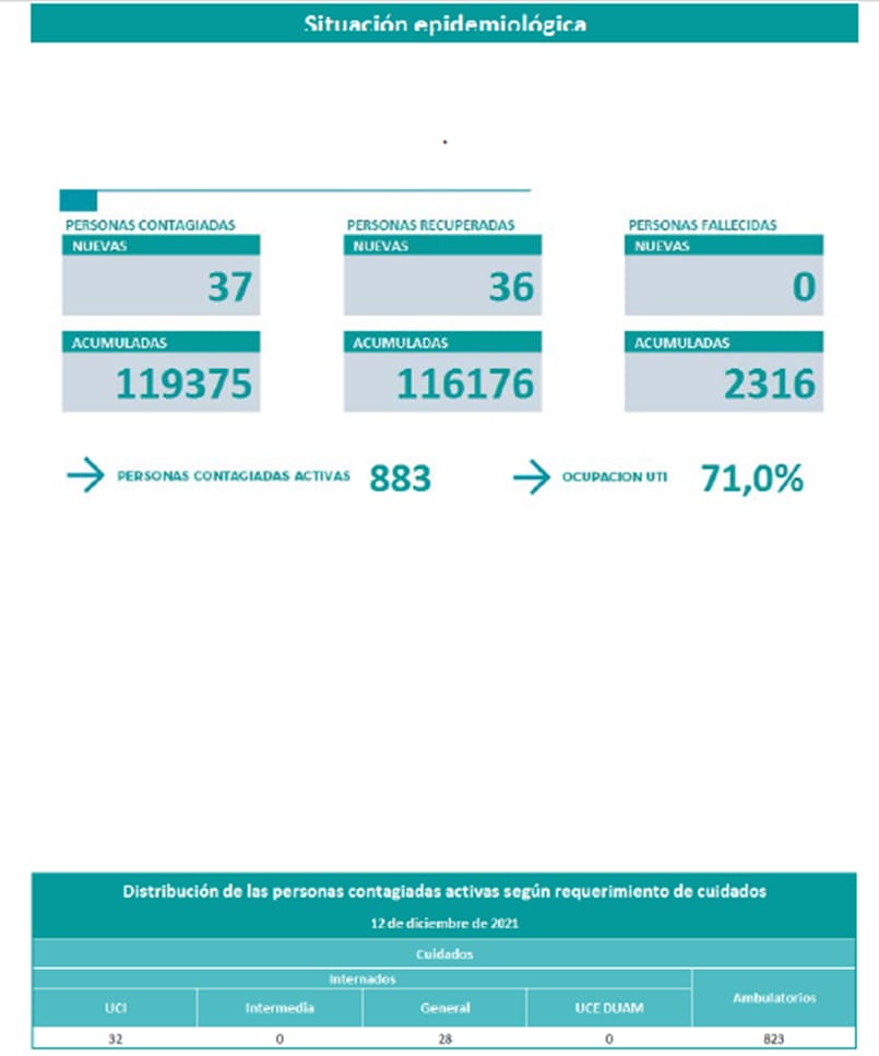 A nivel provincial se registraron 37 casos nuevos y se recuperaron 36. Y aumentó un poco el nivel de ocupación de camas de terapia intensiva, que está en el 71%.