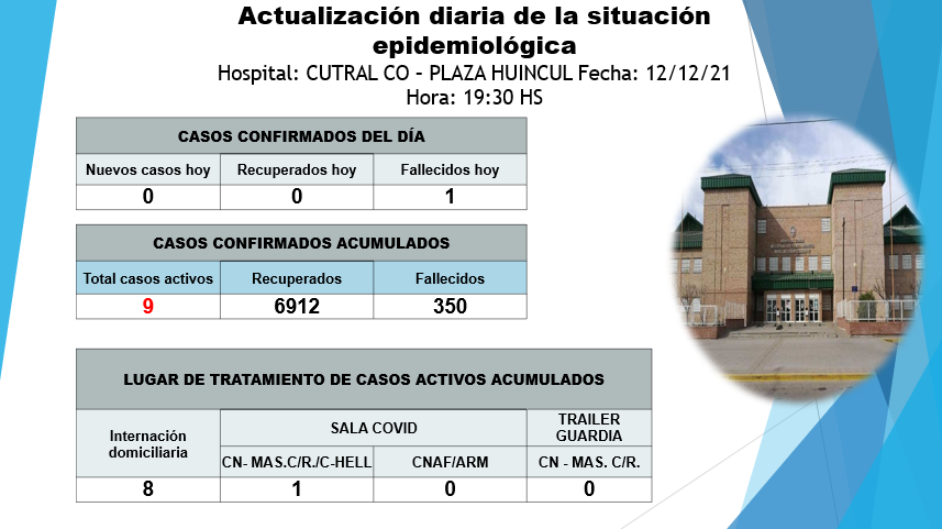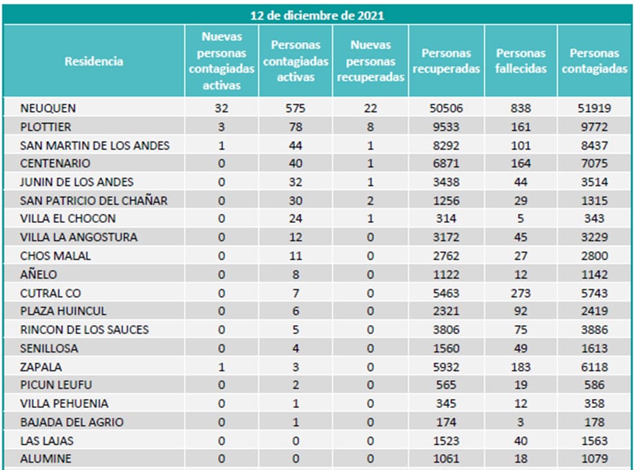 Según el informe de Epidemiología del hospital zonal de Cutral Co y Plaza Huincul, una persona falleció, no hubo contagios nuevos ni recuperados. Hay 9 personas que transitan esta enfermedad.