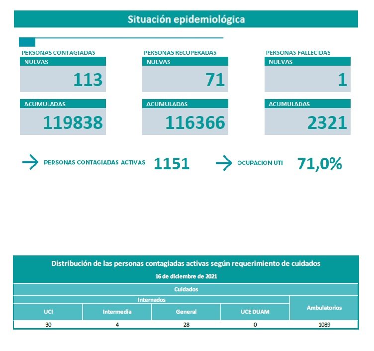 El comite de emergencias provincial indicó que se registraron 113 test positivos de COVID-19 en la provincia, mientras que 71 personas se recuperaron y hubo 1 persona fallecida.