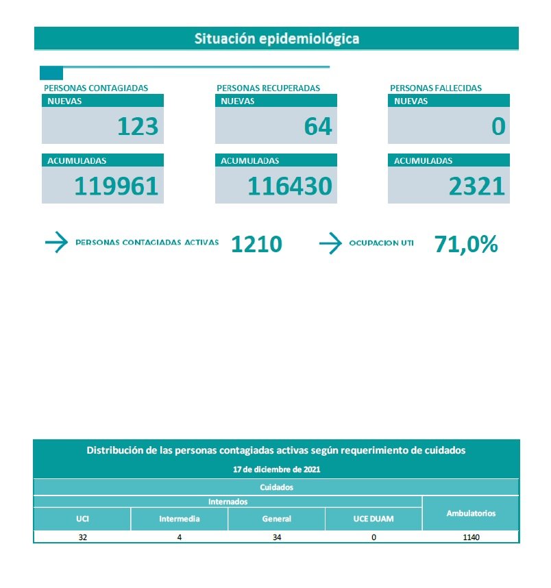 En cuanto a los casos activos en la provincia, hay 1.210 y la ocupación de camas UTI es del 71 %.