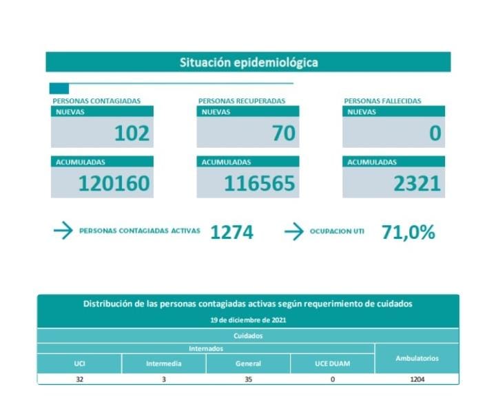 Además se informó que 70 recibieron el alta médica y que por ello la cantidad de neuquinos contagiados es de 1274. El porcentaje de ocupación de camas de terapia intesiva es de 71%.