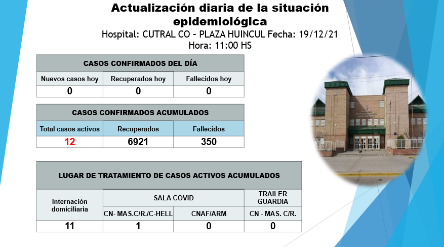La situación epidemiológica de Cutral Co y Plaza Huincul no se modificó este domingo. No hubo contagios, tampoco recuperados ni fallecidos. La cantidad de personas contagiadas es de 12, pero uno de esos casos se agravó y tuvo que ser internado en una Sala Covid.