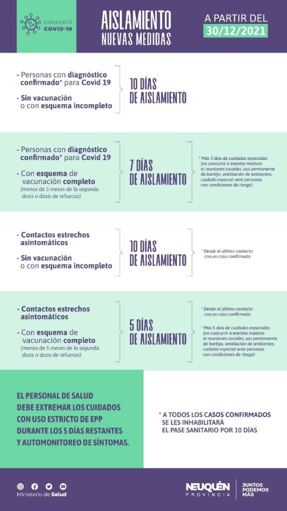 - 7 días de aislamiento desde la fecha de inicio de síntomas (o del diagnóstico en casos asintomáticos), con al menos 48 horas sin síntomas o con síntomas leves, más 3 días de cuidados especiales (no concurrir a eventos masivos ni reuniones sociales, utilizar barbijo de forma adecuada, bien ajustado, tapando nariz, boca y mentón- en forma permanente en ambientes cerrados o abiertos donde haya otras personas, mantener la distancia social, ventilar los ambientes de manera continua, extremar los cuidados ante la presencia de personas con factores de riesgo).