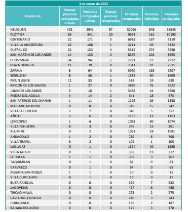 Este lunes 3 de enero, el comité de emergencia provincial confirmó que hubo 1 persona fallecida por coronavirus y 655 nuevos casos en toda la provincia de Neuquen.