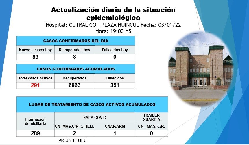 En el informe diario de la situación epidemiológica se indicó que son 291 los casos activos en las dos ciudades. En cuanto a las personas internadas son dos -una de ellas es oriunda de Picún Leufú y está en la sala covid- y hay un paciente que requiere de asistencia respiratoria mecánica por lo que permanece en terapia intensiva.