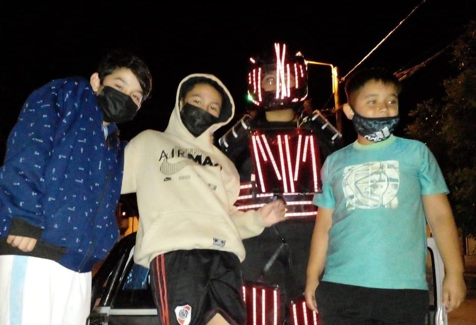 Con un robot led, la comisión organizó un recorrido por las calles del barrio entregando bolsitas de golosinas para que los vecinitos festejen el día de Reyes Magos.
