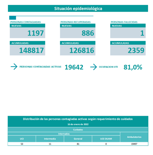 Desde el comité de emergencias provincial se reportaron 1.197 casos confirmados, pero ya no se hisopa a los menores de 60 años por lo que el dato pierde relevancia ya que muchas personas con síntomas no se hacen PCR o hisopado