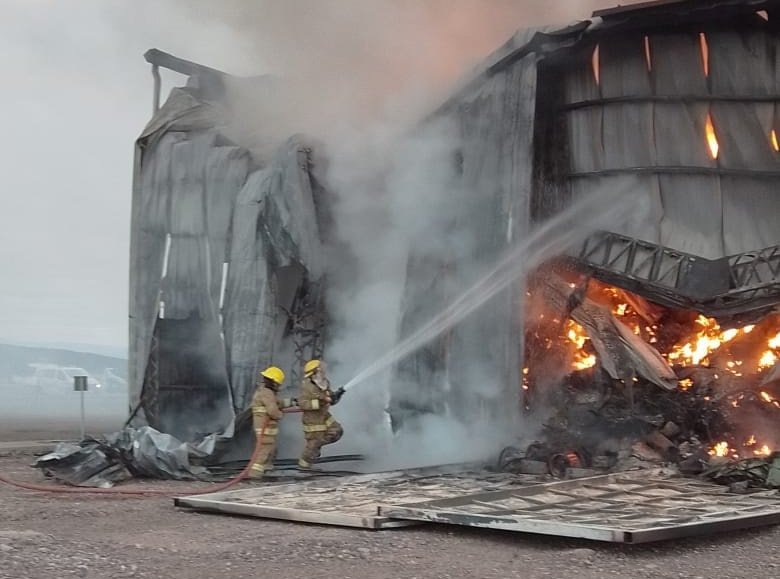 El galpón de la planta de tratamiento de residuos petroleros de Comarsa terminó consumido por el fuego; al igual que sucedió años atrás en Plaza Huincui, con la empresa EET.