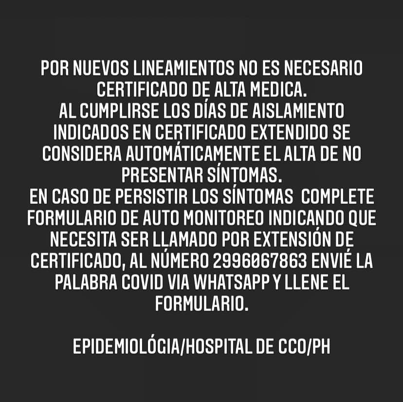 Sin embargo, en caso de persistir los síntomas el paciente deberá completar el formulario de automonitoreo indicando que necesita ser llamado por extensión de certificado al número 2996067863. A ese número se debe enviar la palabra COVID, vía Whatsapp y llenar el formulario”.