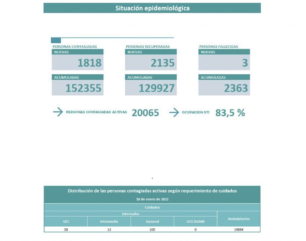 La ocupación de las camas de terapia intensiva sigue en aumento que está hoy en el 83,5%. La cantidad de personas recuperadas son 2.135.