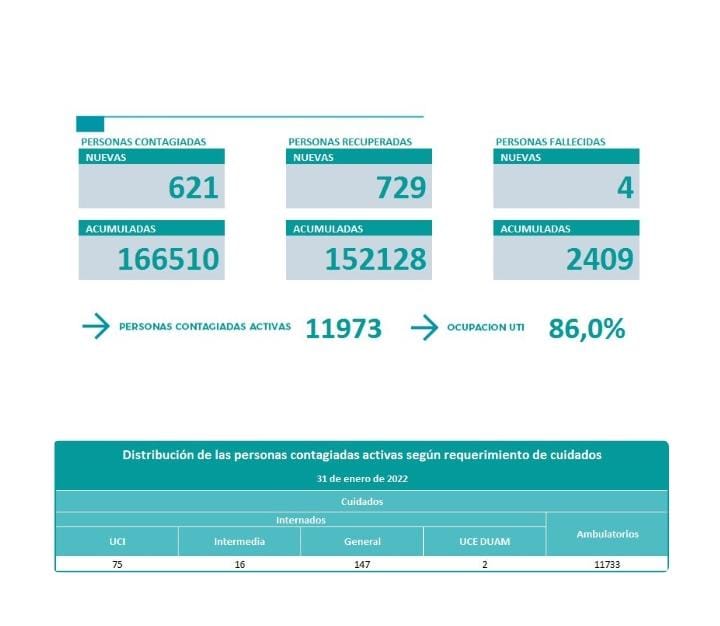 Además se informó que hay 240 personas internadas, 15 más que el domingo. De los internados, 75 están en una cama de terapia intensiva, 16 están en terapia intermedia, 147 están en una sala común y 2 están en el espacio DUAM, que debió habilitarse nuevamente.